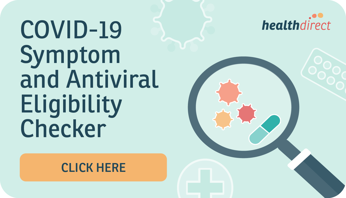 If you think that you may have COVID-19 infection you can use the Healthdirect COVID-19 Symptom and Antiviral Eligibility Checker to find out if you need medical help or if you may be eligible for antiviral medication.